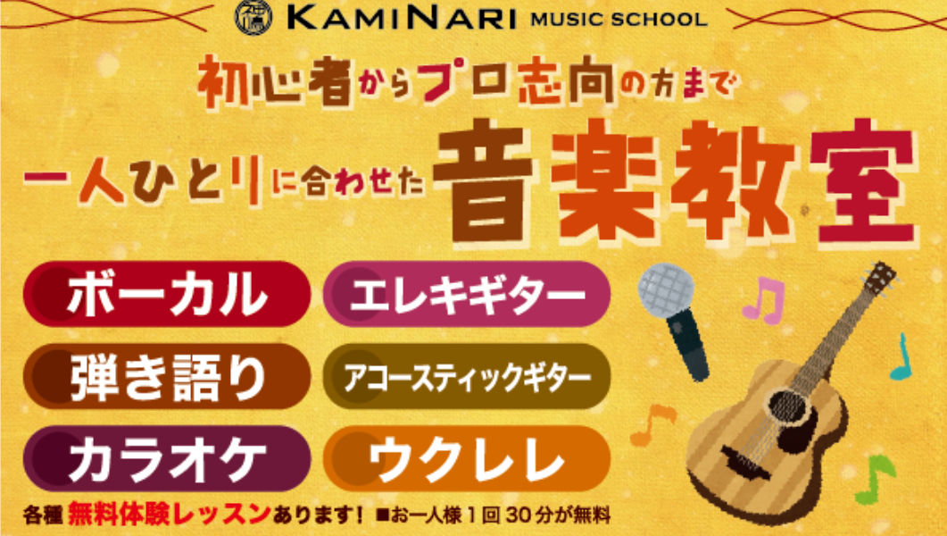 - 楽器店 KAMINARI YOKOHAMA と リペア専門の KAMINARI GUITARS LAB が併設されているので、楽器の選び方からメンテナンス、細かな調整まで、音楽に関するさまざまな相談をまとめてできる!